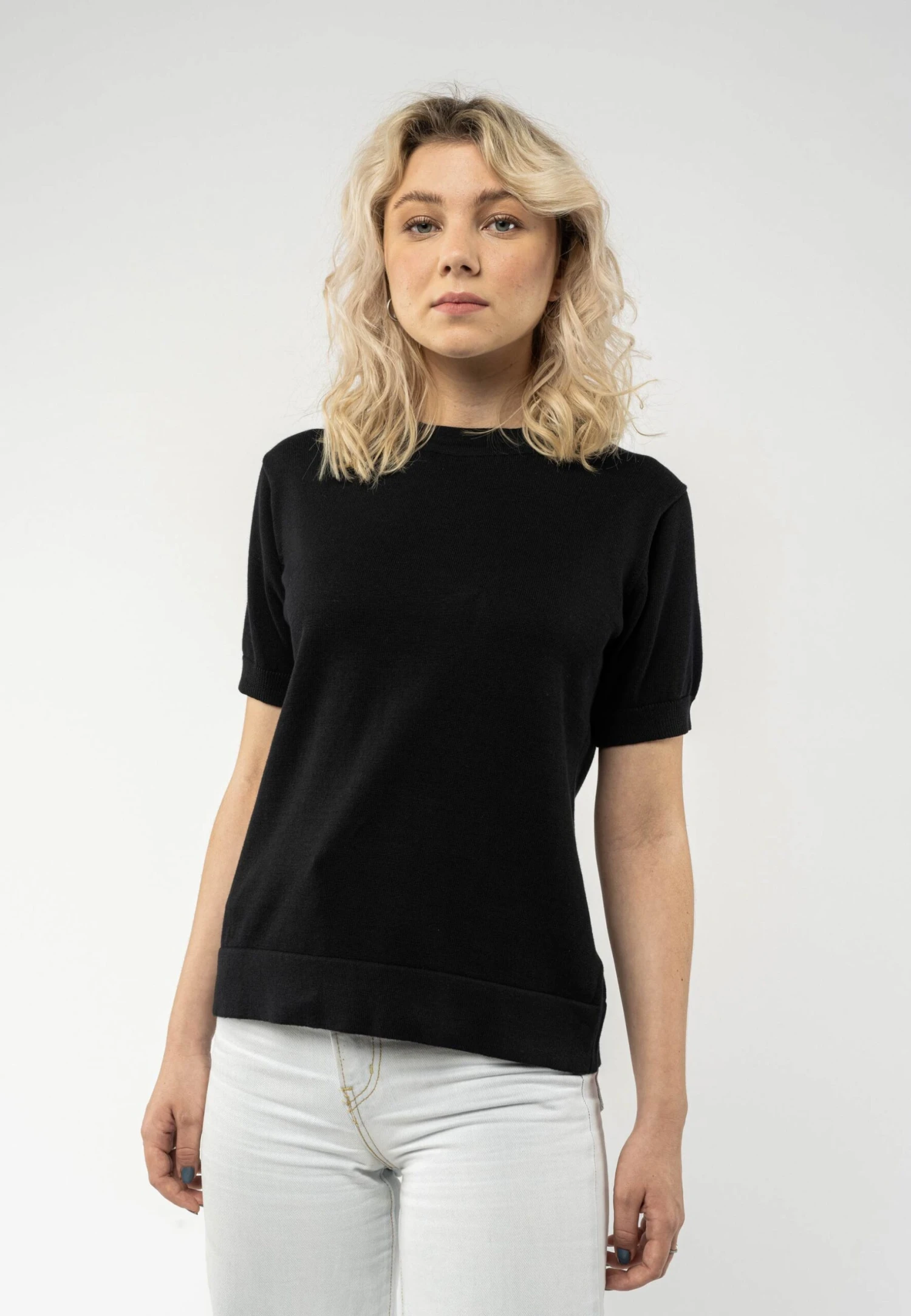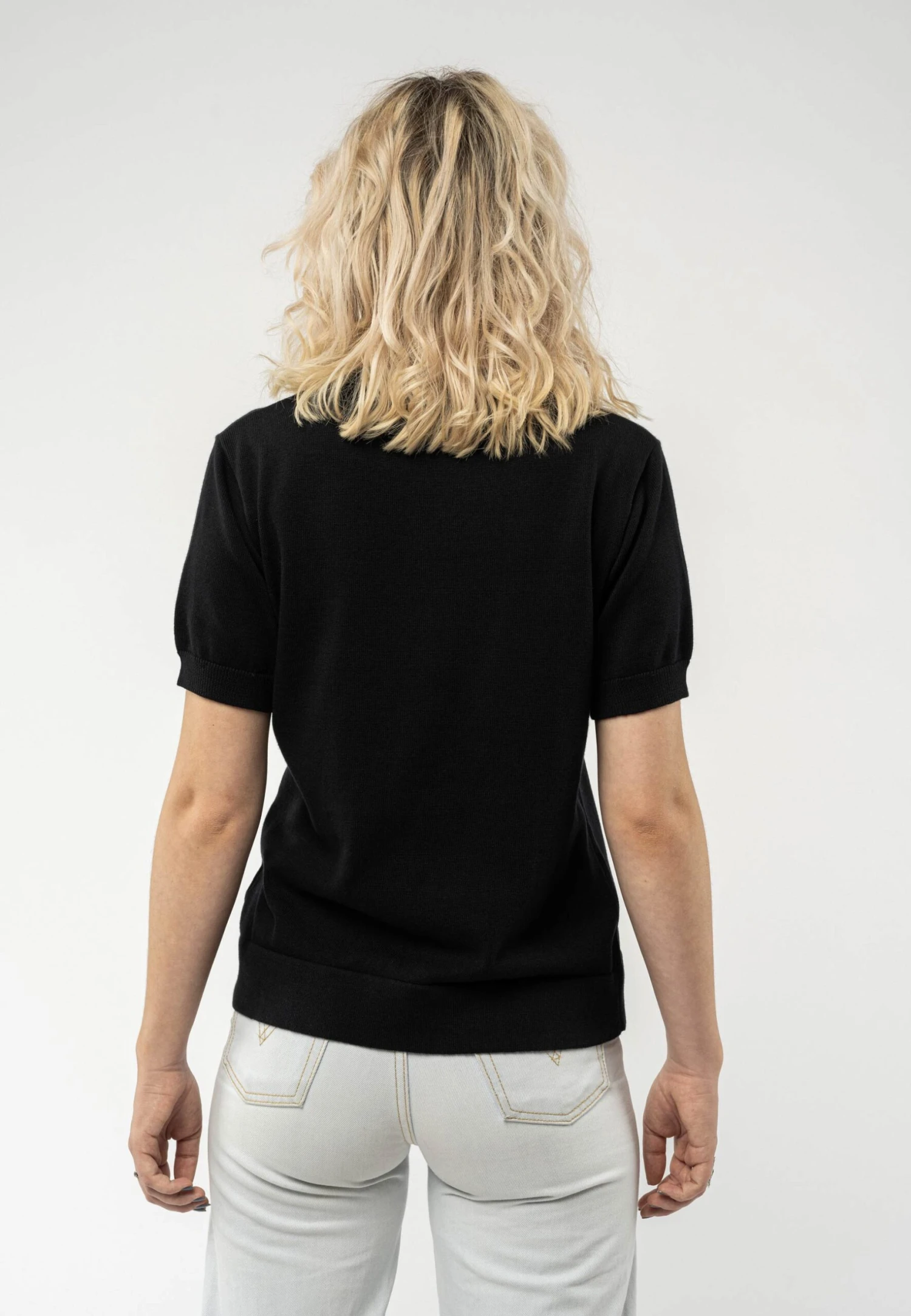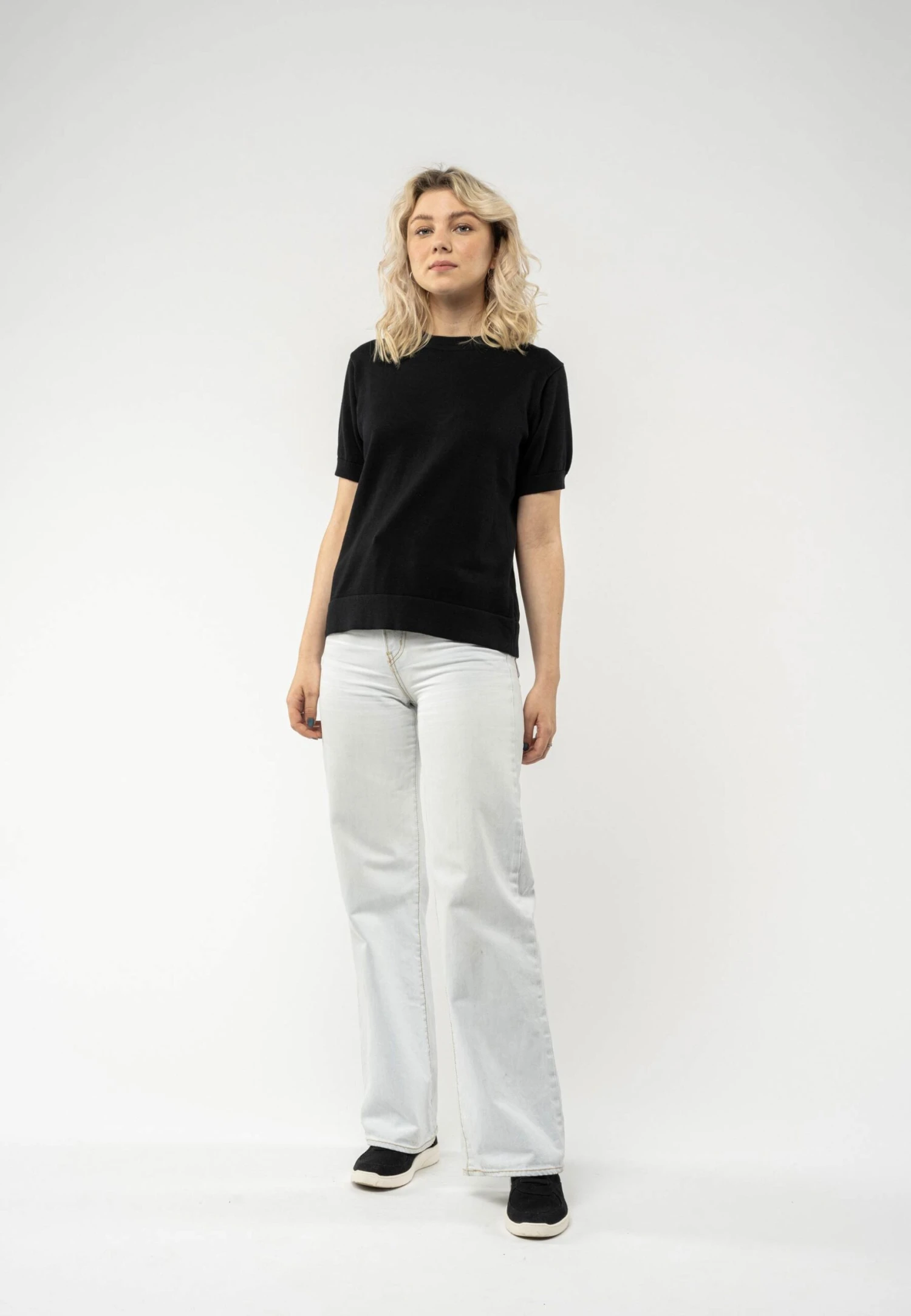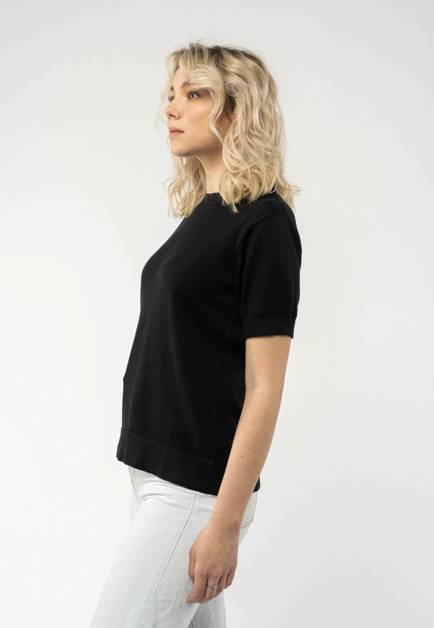 Das T-Shirt aus Feinstrick ist zeitlos und elegant. Es besitzt halblange Ärmel, einen gerippten Rundhalsauschnitt und Rippbündchen. Der klassiche Style ist ein hochwertiges Essential sowohl fürs Büro als auch in der Freizeit.