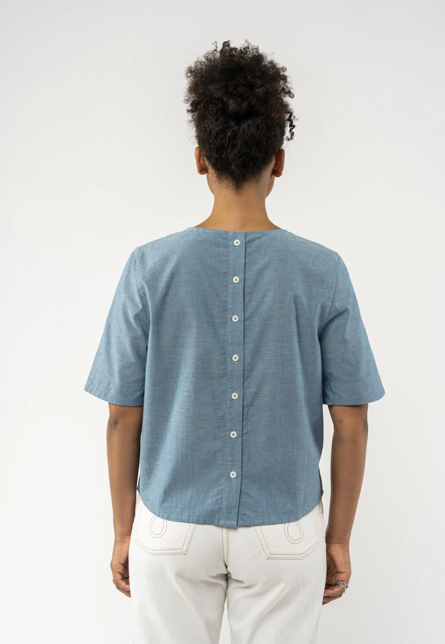 Das kastig geschnittene Top ist aus einem leichten, sommerlichen Webstoff gefertigt. Der lässig- luftige Style ist mit halblangen Ärmeln ausgestattet und die Knopfreihe am Rücken bildet ein raffiniertes Detail.