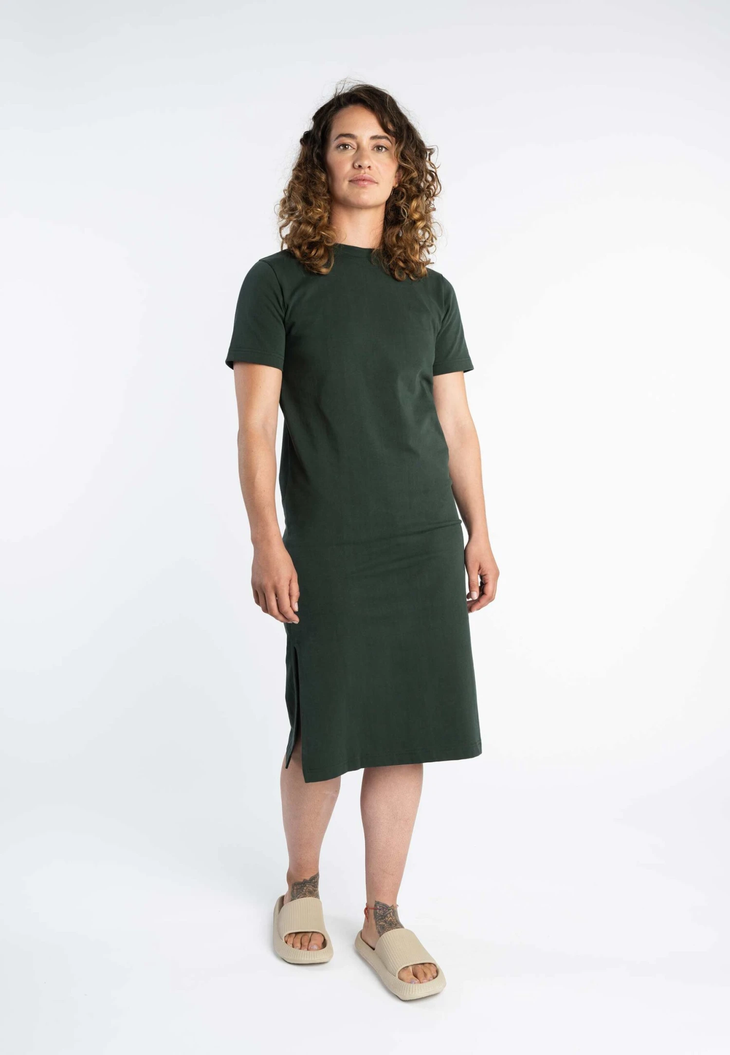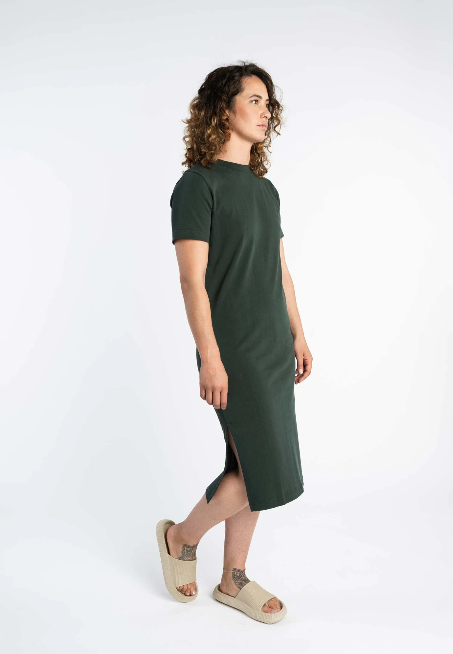 Ein cleaner, lässiger Style für wärmere Tage. Das fast knöchellange, kurzärmlige Kleid besticht durch einen fließenden Fall und besitzt Schlitze an beiden Seitennähten. Durch die kühlende Baumwolle bleibt es atmungsaktiv und der schwere Jerseystoff sorgt für einen modernen, wertigen Look.