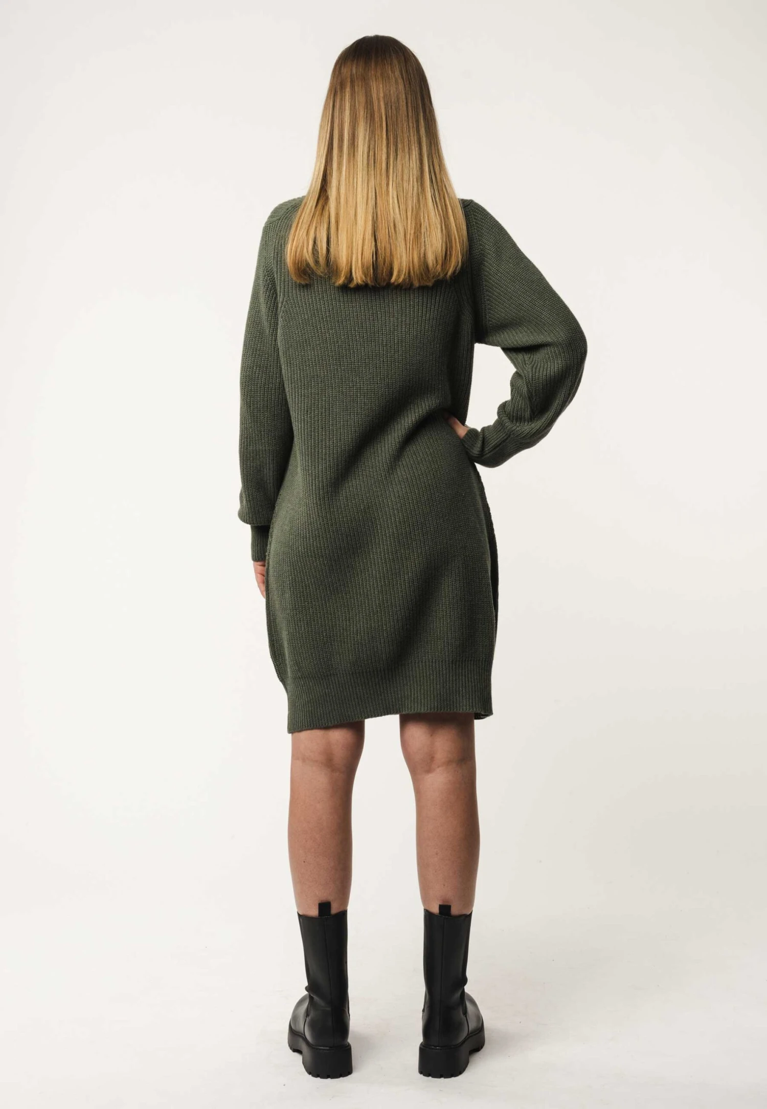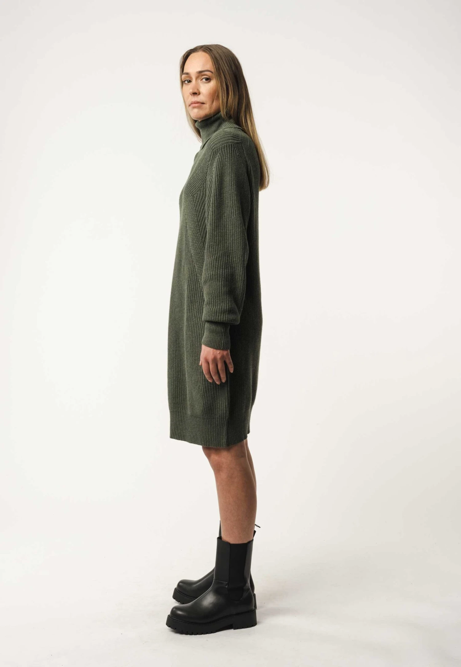 Unser Kleid, hergestellt aus wärmendem Rippstrick, ist modern und lässig geschnitten. Details wie der dicke Rollkragen, die hohen Bündchen, die weit fallenden Ärmel und seine raffinierte Struktur machen es unverzichtbar in Deiner Herbst- und Wintergarderobe.