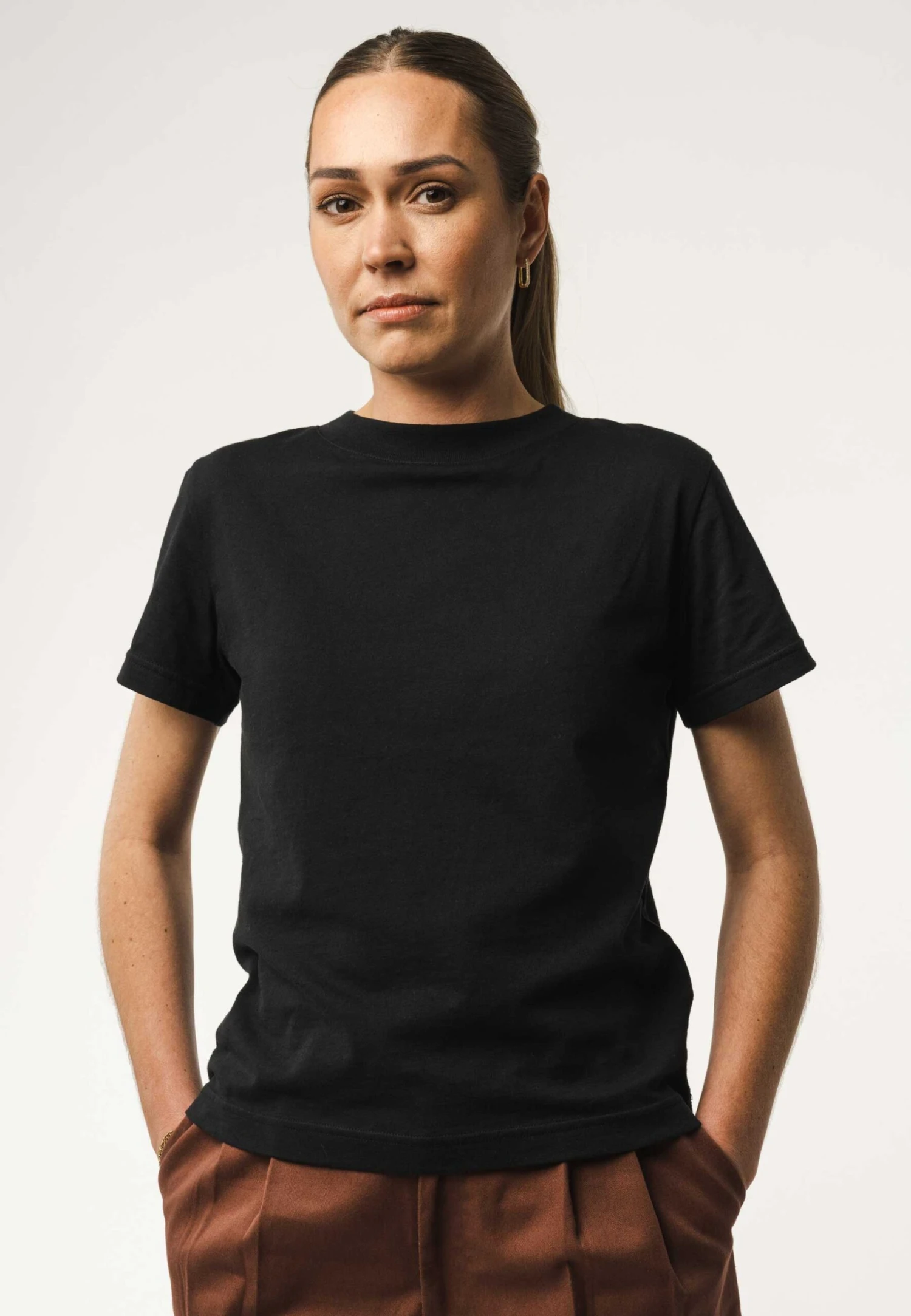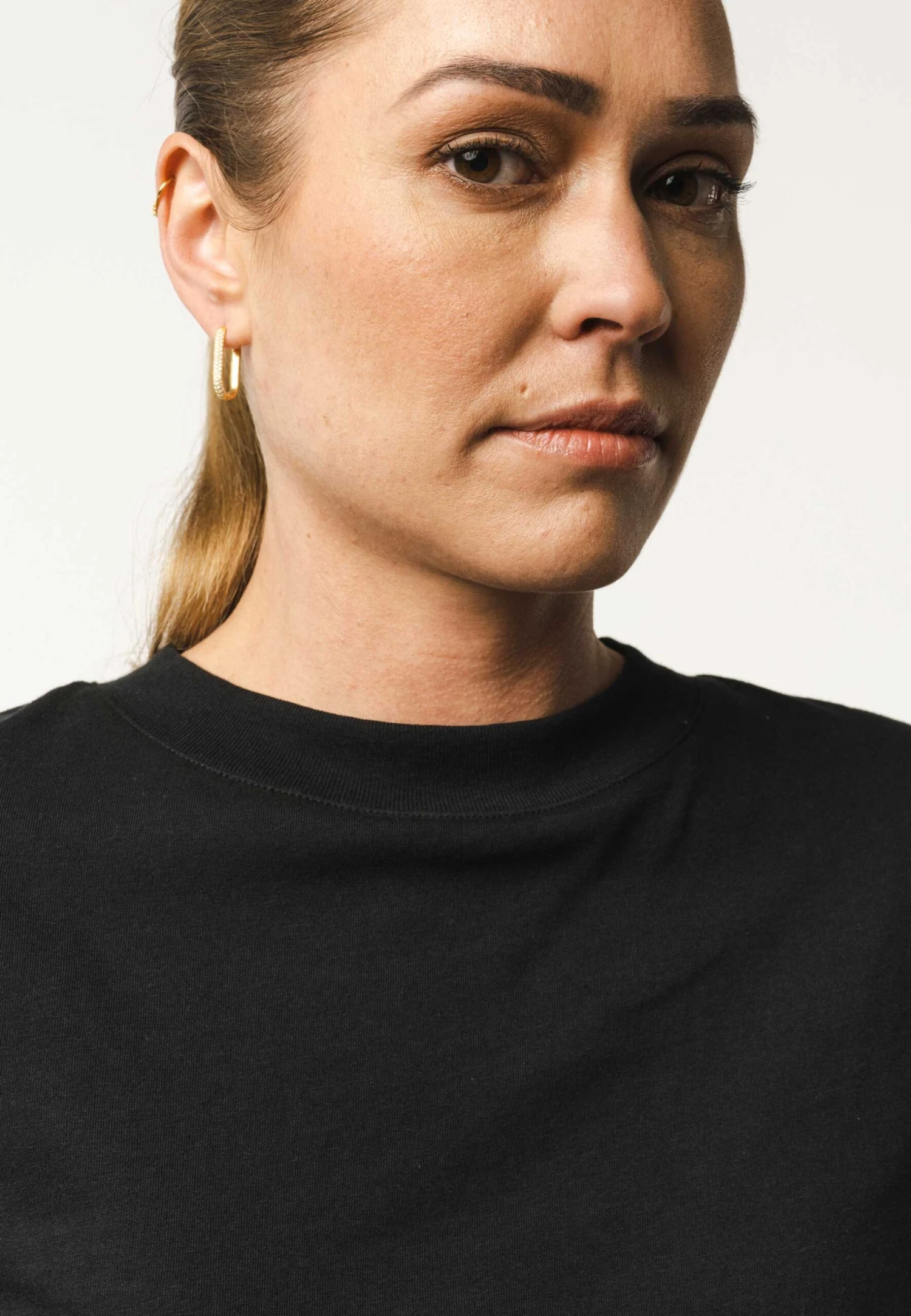Khira, unser modernes, klassisches T-Shirt ist der ideale Begleiter im Alltag und eignet sich damit für jeden Look. Die gerade Passform wird durch den breiten, hochgeschlossenen Rundhalsausschnitt mit feinem Rippbündchen und aufgesetzter Naht komplettiert.