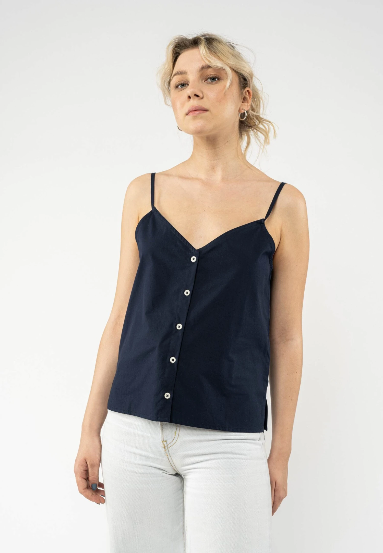 Mohini ist ein sommerlich luftiges Top mit Spaghetti-Trägern und V-Ausschnitt. Eine fortlaufende Knopfleiste mit Knöpfen aus Steinnuss rundet den klassischen Look ab und macht Mohini zu einem schicken Top und hochwertigem Basic, das jedes Outfit aufwertet.
