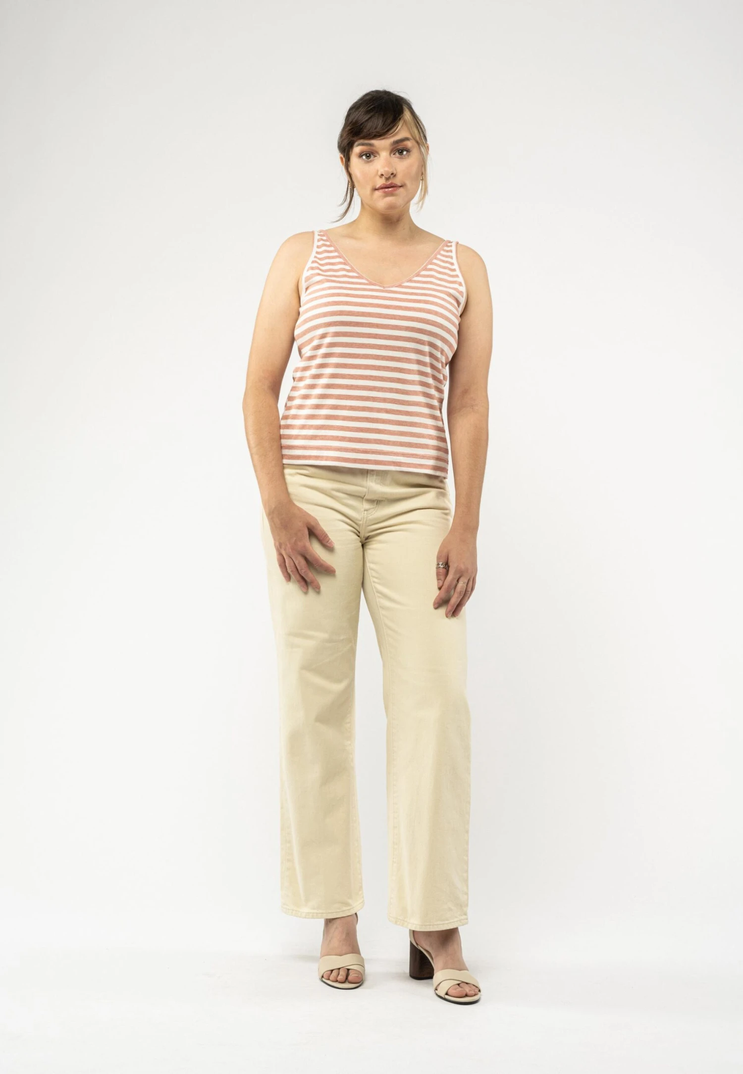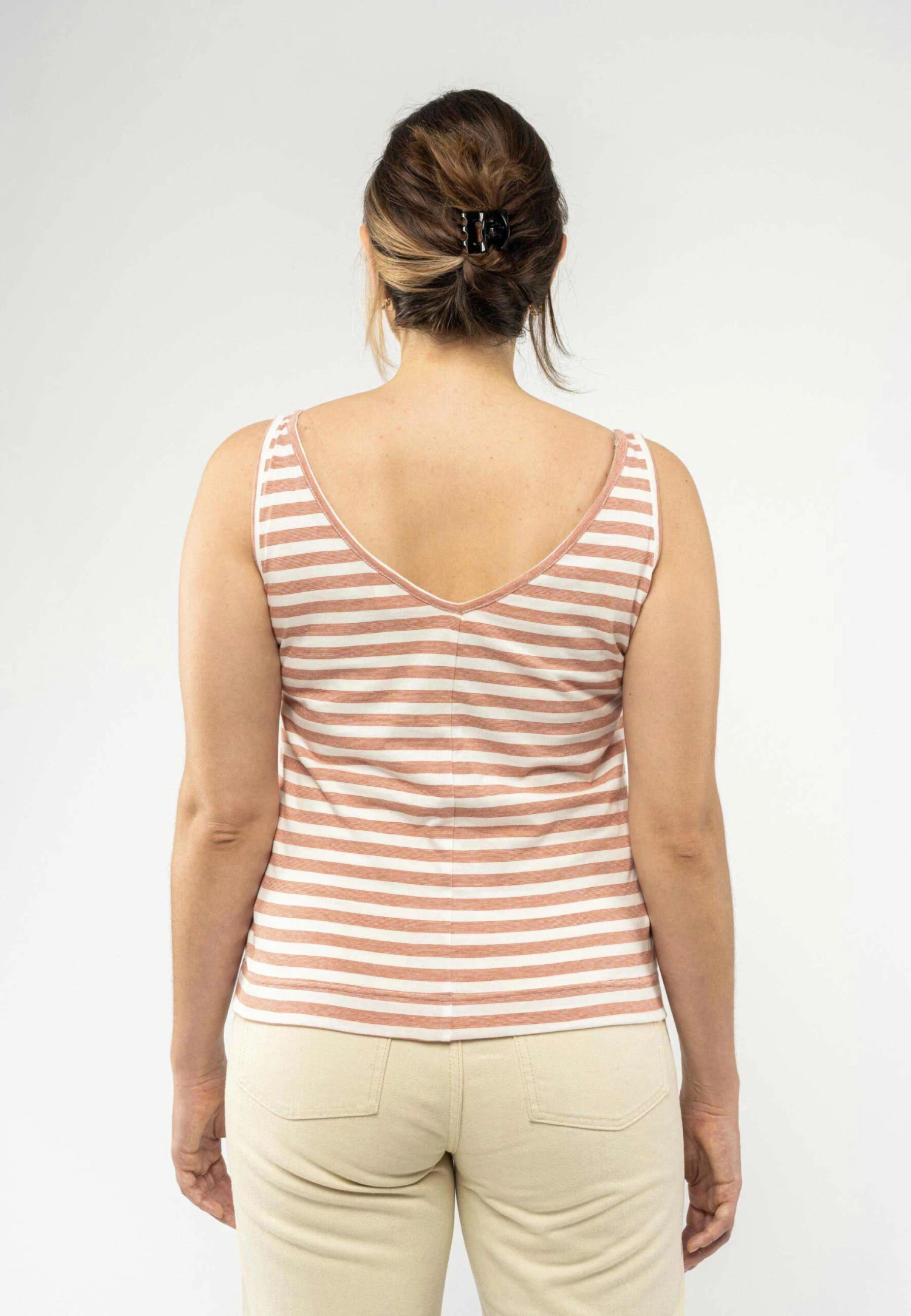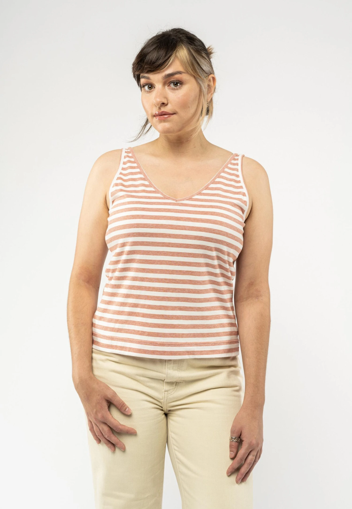 Pina ist ein klassisches Top mit V-Ausschnitt und Ziernaht am Rücken. Der luftige Baumwollstoff macht Pina zum idealen Look für sommerlich warme Temperaturen.